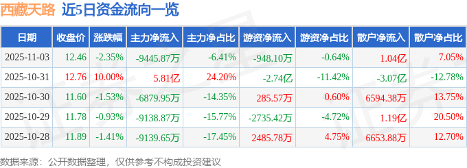 证券之星消息,截至2025年11月3日收盘,西藏天路(600326)报收于12.46元,下跌2.35%,换手率8.75%,成交量119.19万手,成交额14.75亿元。