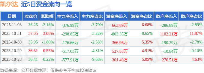 证券之星消息,截至2025年11月3日收盘,凯尔达(688255)报收于36.25元,下跌2.16%,换手率2.48%,成交量2.72万手,成交额9938.64万元。