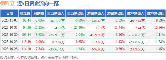 证券之星消息,截至2025年11月3日收盘,德科立(688205)报收于92.44元,下跌2.03%,换手率3.5%,成交量5.53万手,成交额5.11亿元。