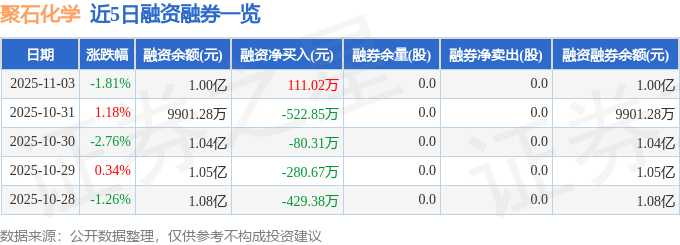 聚石化学融资融券信息显示,融资方面,当日融资买入332.46万元,融资偿还221.44万元,融资净买入111.02万元。融券方面,融券卖出0.0股,融券偿还0.0股,融券余量0.0股,融券余额0.0万元。融资融券余额1.0亿元。