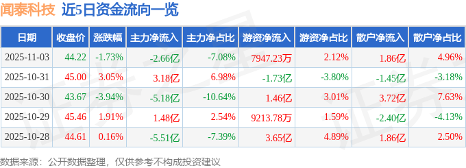 11月3日的资金流向数据方面,主力资金净流出2.66亿元,占总成交额7.08%,游资资金净流入7947.23万元,占总成交额2.12%,散户资金净流入1.86亿元,占总成交额4.96%。