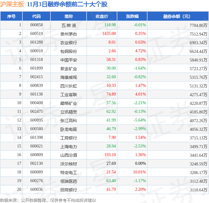 沪深主板融券余额前三分别为:五 粮 液(000858)融券余额7704.8万元、贵州茅台(600519)融券余额7512.94万元、农业银行(601288)融券余额6903.34万元,前20具体见下表: