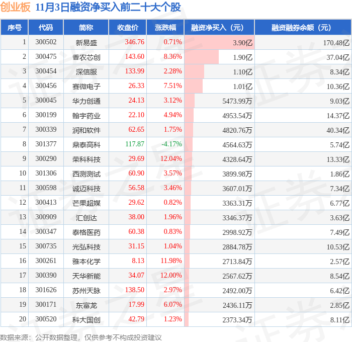 创业板融资净买入前三分别为:新易盛(300502)融资净买入3.9亿元、香农芯创(300475)融资净买入1.9亿元、深信服(300454)融资净买入1.1亿元,前20具体见下表: