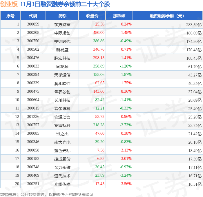 创业板融资融券余额前三分别为:东方财富(300059)融资融券余额283.59亿元、中际旭创(300308)融资融券余额186.69亿元、宁德时代(300750)融资融券余额174.8亿元,前20具体见下表: