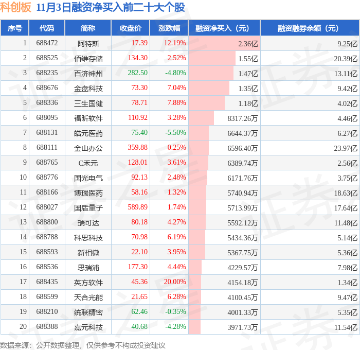 科创板融资净买入前三分别为:阿特斯(688472)融资净买入2.36亿元、佰维存储(688525)融资净买入1.55亿元、百济神州(688235)融资净买入1.47亿元,前20具体见下表: