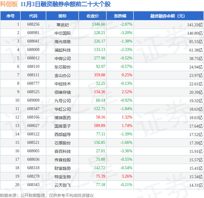 科创板融资融券余额前三分别为:寒武纪(688256)融资融券余额141.33亿元、中芯国际(688981)融资融券余额140.8亿元、海光信息(688041)融资融券余额85.55亿元,前20具体见下表: