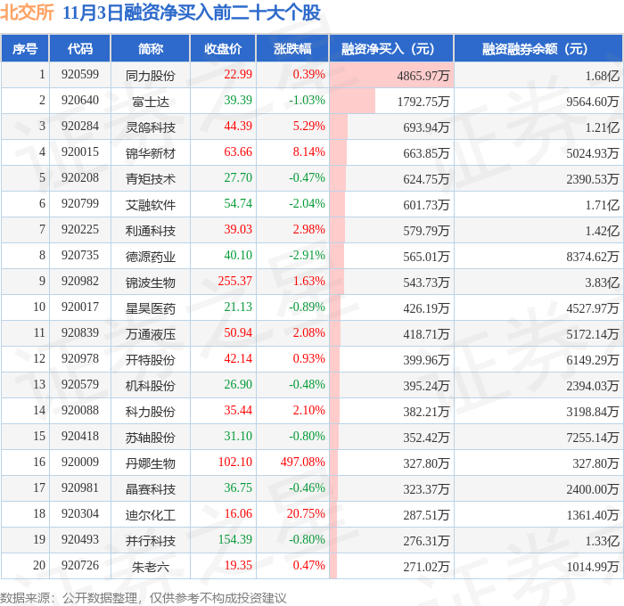 北交所融资净买入前三分别为:同力股份(920599)融资净买入4865.97万元、富士达(920640)融资净买入1792.75万元、灵鸽科技(920284)融资净买入693.94万元,前20具体见下表: