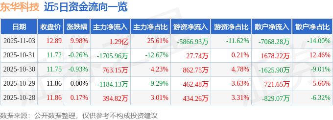 证券之星消息,截至2025年11月3日收盘,东华科技(002140)报收于12.89元,上涨9.98%,涨停,换手率7.42%,成交量40.32万手,成交额5.05亿元。
