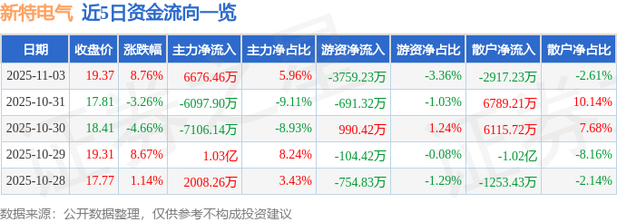 证券之星消息,截至2025年11月3日收盘,新特电气(301120)报收于19.37元,上涨8.76%,换手率26.71%,成交量58.38万手,成交额11.19亿元。