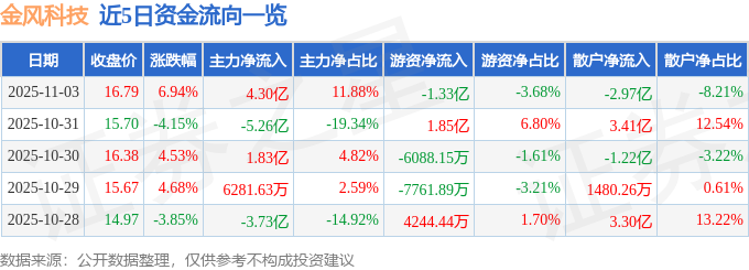 证券之星消息,截至2025年11月3日收盘,金风科技(002202)报收于16.79元,上涨6.94%,换手率6.63%,成交量222.53万手,成交额36.22亿元。
