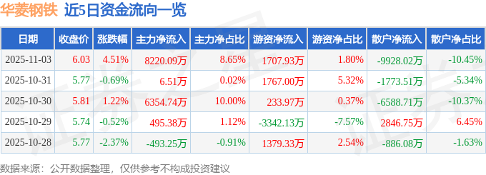证券之星消息,截至2025年11月3日收盘,华菱钢铁(000932)报收于6.03元,上涨4.51%,换手率2.29%,成交量158.48万手,成交额9.5亿元。