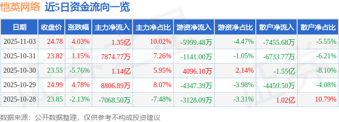 证券之星消息,截至2025年11月3日收盘,恺英网络(002517)报收于24.78元,上涨4.03%,换手率2.91%,成交量54.9万手,成交额13.43亿元。