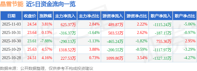 证券之星消息,截至2025年11月3日收盘,晶雪节能(301010)报收于24.54元,上涨3.81%,换手率8.44%,成交量9.12万手,成交额2.21亿元。