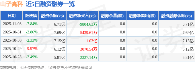 证券之星消息,截至2025年11月3日收盘,山子高科(000981)报收于3.76元,下跌7.84%,换手率14.27%,成交量1357.42万手,成交额50.58亿元。