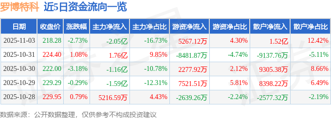 证券之星消息,截至2025年11月3日收盘,罗博特科(300757)报收于218.28元,下跌2.73%,换手率3.82%,成交量5.66万手,成交额12.24亿元。