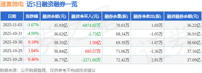 通富微电融资融券信息显示,融资方面,当日融资买入3.33亿元,融资偿还4.02亿元,融资净偿还6874.82万元。融券方面,融券卖出2.6万股,融券偿还9100.0股,融券余量70.03万股,融券余额2922.97万元。融资融券余额36.22亿元。