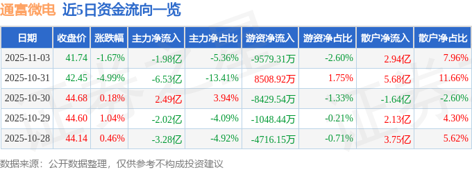 证券之星消息,截至2025年11月3日收盘,通富微电(002156)报收于41.74元,下跌1.67%,换手率5.9%,成交量89.59万手,成交额36.9亿元。