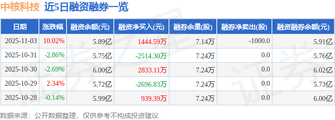 中核科技融资融券信息显示,融资方面,当日融资买入1.29亿元,融资偿还1.14亿元,融资净买入1444.59万元。融券方面,融券卖出0.0股,融券偿还1000.0股,融券余量7.14万股,融券余额165.36万元。融资融券余额5.91亿元。