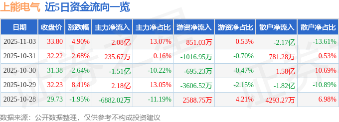 证券之星消息,截至2025年11月3日收盘,上能电气(300827)报收于33.8元,上涨4.9%,换手率12.5%,成交量48.17万手,成交额15.92亿元。