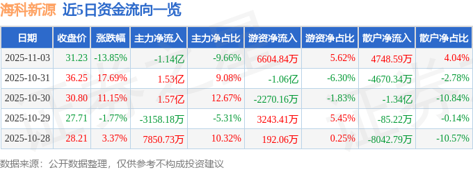 证券之星消息,截至2025年11月3日收盘,海科新源(301292)报收于31.23元,下跌13.85%,换手率44.19%,成交量37.59万手,成交额11.75亿元。