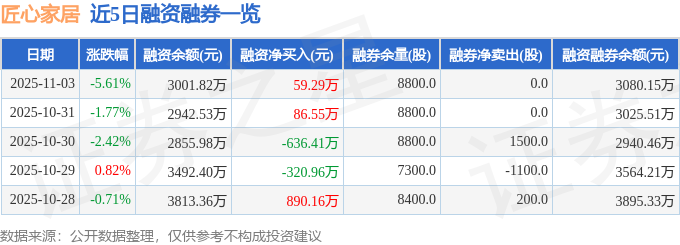 匠心家居融资融券信息显示,融资方面,当日融资买入1179.06万元,融资偿还1119.77万元,融资净买入59.29万元。融券方面,融券卖出0.0股,融券偿还0.0股,融券余量8800.0股,融券余额78.33万元。融资融券余额3080.15万元。