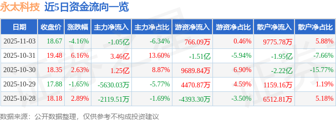 证券之星消息,截至2025年11月3日收盘,永太科技(002326)报收于18.67元,下跌4.16%,换手率10.96%,成交量88.57万手,成交额16.62亿元。
