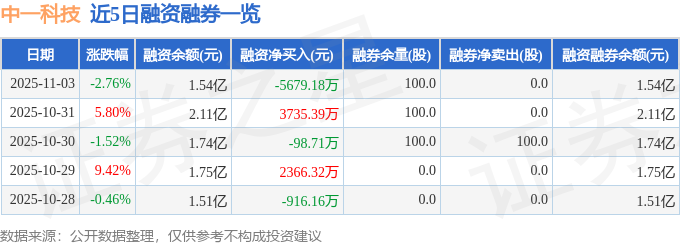 中一科技融资融券信息显示,融资方面,当日融资买入3442.76万元,融资偿还9121.94万元,融资净偿还5679.18万元。融券方面,融券卖出0.0股,融券偿还0.0股,融券余量100.0股,融券余额0.43万元。融资融券余额1.54亿元。