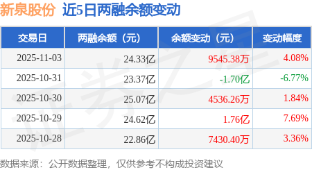 证券之星消息,11月3日,新泉股份(603179)融资买入2.96亿元,融资偿还2.01亿元,融资净买入9497.37万元,融资余额24.13亿元,当日融资净买入排名第40,近20个交易日中有13个交易日出现融资净买入。