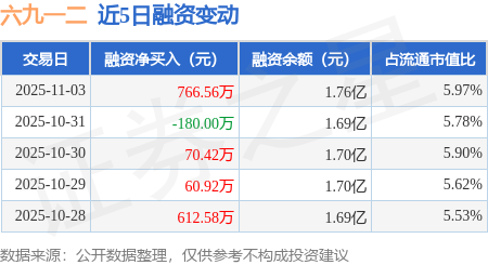 证券之星消息,11月3日,六九一二(301592)融资买入1195.82万元,融资偿还429.25万元,融资净买入766.56万元,融资余额1.76亿元。