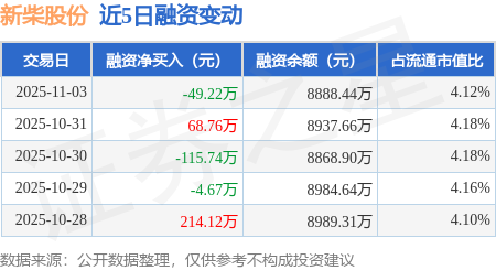 证券之星消息,11月3日,新柴股份(301032)融资买入226.94万元,融资偿还276.16万元,融资净卖出49.22万元,融资余额8888.44万元。