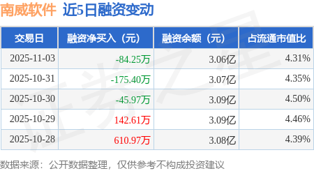 证券之星消息,11月3日,南威软件(603636)融资买入1488.4万元,融资偿还1572.65万元,融资净卖出84.25万元,融资余额3.06亿元。