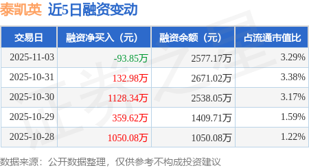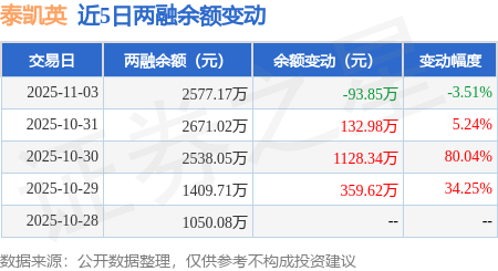 证券之星消息,11月3日,泰凯英(920020)融资买入257.29万元,融资偿还351.14万元,融资净卖出93.85万元,融资余额2577.17万元。