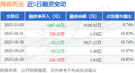 证券之星消息,11月3日,海森药业(001367)融资买入215.05万元,融资偿还1282.71万元,融资净卖出1067.66万元,融资余额9198.81万元,近20个交易日中有11个交易日出现融资净买入。