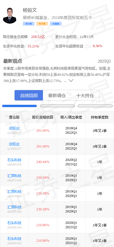 爱旭股份(600732)是基金经理杨锐文的重仓股。,其在整个职业生涯内年化收益高达15.21%。杨锐文的大佬持仓 - 战绩回顾截图如下: