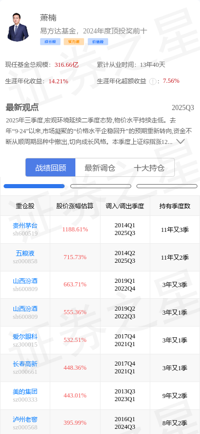 紫金矿业(601899)是基金大佬萧楠的重仓股。,其在整个职业生涯内年化收益高达14.21%。萧楠管理的易方达瑞恒灵活配置混合基金在2022年4季度调入紫金矿业,在持有2个季度后在2023年2季度调出,持有期间的估算收益率达到25.86%。(以上数据经过后复权近似计算)萧楠的大佬持仓 - 战绩回顾截图如下: