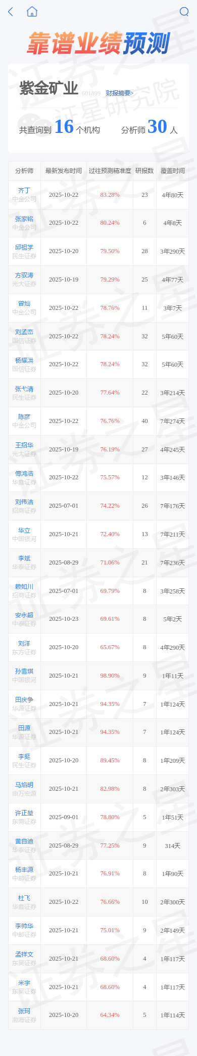 如果您对这家公司感兴趣,可以参考证星研究院统计的紫金矿业的分析师业绩预测数据,其中根据中金公司的分析师齐丁预测公司未来PE为nan(更多特色估值数据尽在证星研究院,所有数据均来源公开资料,期且所有资料都存在一定时间滞后,所有相关数据均不可作为投资决策单一依据)。