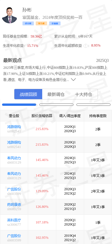 骄成超声(688392)是基金经理孙彬的重仓股。,其在整个职业生涯内年化收益高达15.71%。孙彬的大佬持仓 - 战绩回顾截图如下: