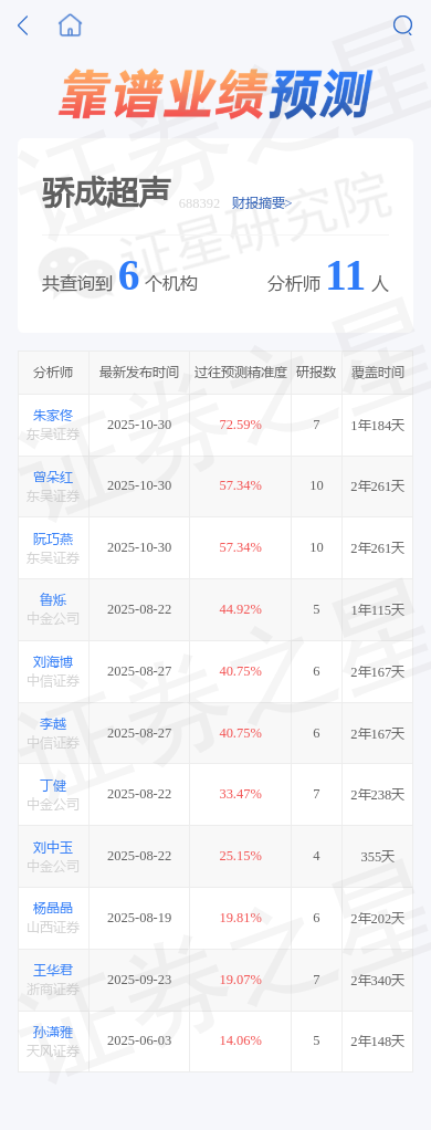 如果您对这家公司感兴趣,可以参考证星研究院统计的骄成超声的分析师业绩预测数据,其中根据东吴证券的分析师朱家佟预测公司未来PE为33.0(更多特色估值数据尽在证星研究院,所有数据均来源公开资料,期且所有资料都存在一定时间滞后,所有相关数据均不可作为投资决策单一依据)。
