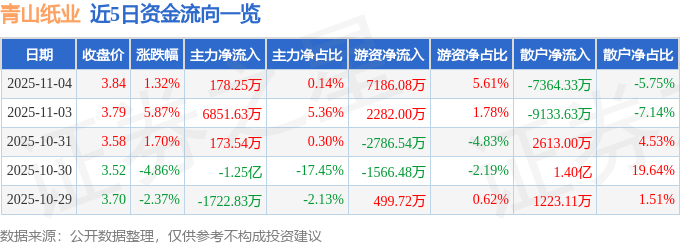 证券之星消息,截至2025年11月4日收盘,青山纸业(600103)报收于3.84元,上涨1.32%,换手率15.15%,成交量335.25万手,成交额12.8亿元。