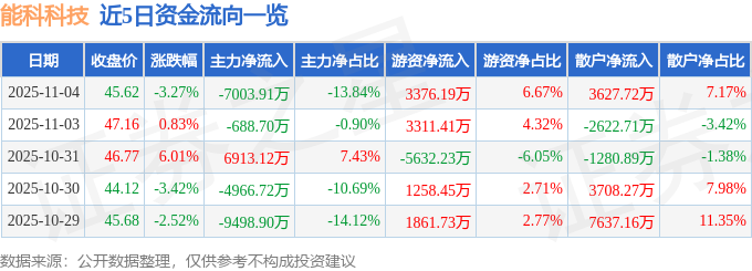 11月4日的资金流向数据方面,主力资金净流出7003.91万元,占总成交额13.84%,游资资金净流入3376.19万元,占总成交额6.67%,散户资金净流入3627.72万元,占总成交额7.17%。