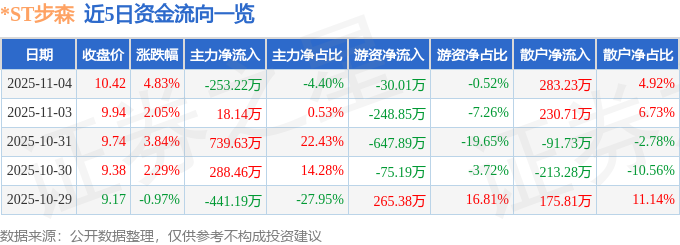 证券之星消息,截至2025年11月4日收盘,*ST步森(002569)报收于10.42元,上涨4.83%,换手率4.01%,成交量5.61万手,成交额5758.06万元。