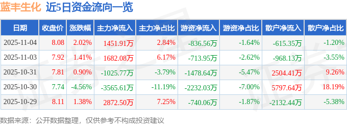 证券之星消息,截至2025年11月4日收盘,蓝丰生化(002513)报收于8.08元,上涨2.02%,换手率23.88%,成交量63.33万手,成交额5.11亿元。