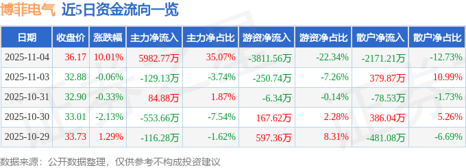 证券之星消息,博菲电气11月4日涨停收盘,收盘价36.17元。该股于11点14分涨停,未打开涨停,截止收盘封单资金为7520.29万元,占其流通市值2.65%。