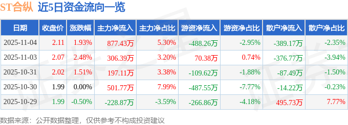 证券之星消息,截至2025年11月4日收盘,ST合纵(300477)报收于2.11元,上涨1.93%,换手率7.85%,成交量77.75万手,成交额1.65亿元。