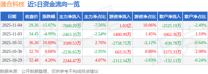 证券之星消息,截至2025年11月4日收盘,通合科技(300491)报收于29.26元,下跌15.07%,换手率21.26%,成交量33.08万手,成交额10.13亿元。