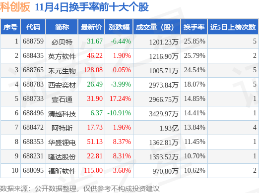当日科创板换手率前10大个股中7只个股收涨,平均涨幅5.93%,其中必贝特(688759)以换手率25.85%排第一,6只个股近5个交易日中多次上榜。