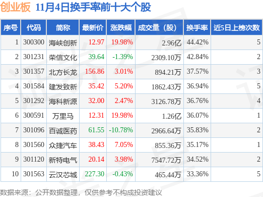 当日创业板换手率前10大个股中7只个股收涨,平均涨幅8.81%,其中海峡创新(300300)以换手率44.42%排第一,8只个股近5个交易日中多次上榜。