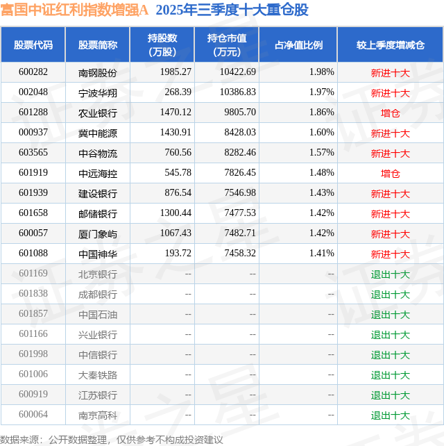 根据2025基金Q3季报公募基金重仓股数据,重仓该股的公募基金共10家,其中持有数量最多的公募基金为富国基金的富国中证红利指数增强A。富国中证红利指数增强A目前规模为48.25亿元,最新净值1.046(11月3日),较上一交易日上涨0.67%,近一年上涨10.3%。该公募基金现任基金经理为徐幼华 方旻。徐幼华在任的基金产品包括:富国中证1000指数增强(LOF)A,管理时间为2018年5月31日至今,期间收益率为151.67%;富国大盘价值量化精选混合A,管理时间为2018年7月19日至今,期间收益率为69.28%;富国MSCI中国A股国际通指数增强A,管理时间为2018年12月25日至今,期间收益率为146.71%。方旻在任的基金产品包括:富国沪深300指数增强A,管理时间为2014年11月19日至今,期间收益率为186.82%;富国中证500指数增强(LOF)A,管理时间为2014年11月19日至今,期间收益率为151.89%;上证综指ETF,管理时间为2014年11月19日至今,期间收益率为128.31%。