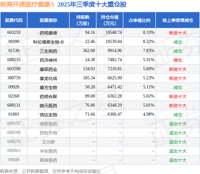 根据2025基金Q3季报公募基金重仓股数据,重仓该股的公募基金共17家,其中持有数量最多的公募基金为前海开源基金的前海开源医疗健康A。前海开源医疗健康A目前规模为5.46亿元,最新净值1.2657(11月3日),较上一交易日下跌0.93%,近一年上涨42.05%。该公募基金现任基金经理为范洁。范洁在任的基金产品包括:前海开源中药股票A,管理时间为2019年5月15日至今,期间收益率为68.72%;前海开源公共卫生股票A,管理时间为2021年3月25日至今,期间收益率为-52.92%。