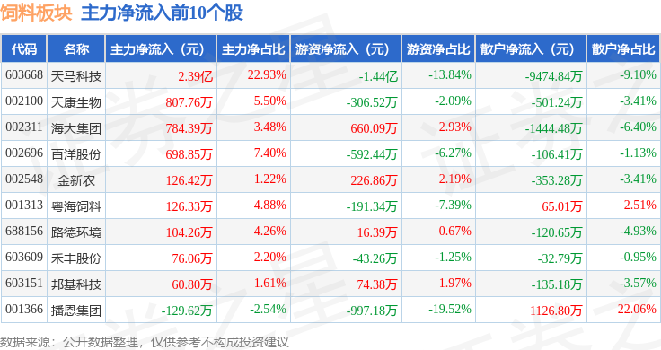 从资金流向上来看,当日饲料板块主力资金净流入1.53亿元,游资资金净流出1.08亿元,散户资金净流出4483.89万元。饲料板块个股资金流向见下表: